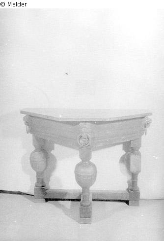 Fundmeldung | Einzelobjekt Dreieckiger Wandtisch Lost Art-ID220428 Vorherige Weiter Hersteller/Künstler:in Unbekannt (Niederländisch) TitelDreieckiger Wandtisch Datierung1601/1700ObjektartMöbelObjektgruppeKunsthandwerk / -gewerbeMaterial / TechnikHolz Höhe 74,00 cm Breite 98,00 cm Tiefe 53,00 cm Inventarnummermü6289Beschreibung Platte an den Ecken jeweils stumpf, darunter je ein Löwenkopf mit Ring - auf 3 balusterartigen Füßen, unten untereinander verstrebt. Weiterlesen Weniger anzeigen Bestand Kulturgüter aus dem ehemaligen ReichsvermögenVeröffentlicht seit2001 Kontakt Kunstverwaltung des Bundes Herbert-Bayer-Straße 5 13086 Berlin Deutschland E-Mailprovenienzforschung@kvdb.bund.deHomepagehttp://www.kunstverwaltung.bund.de