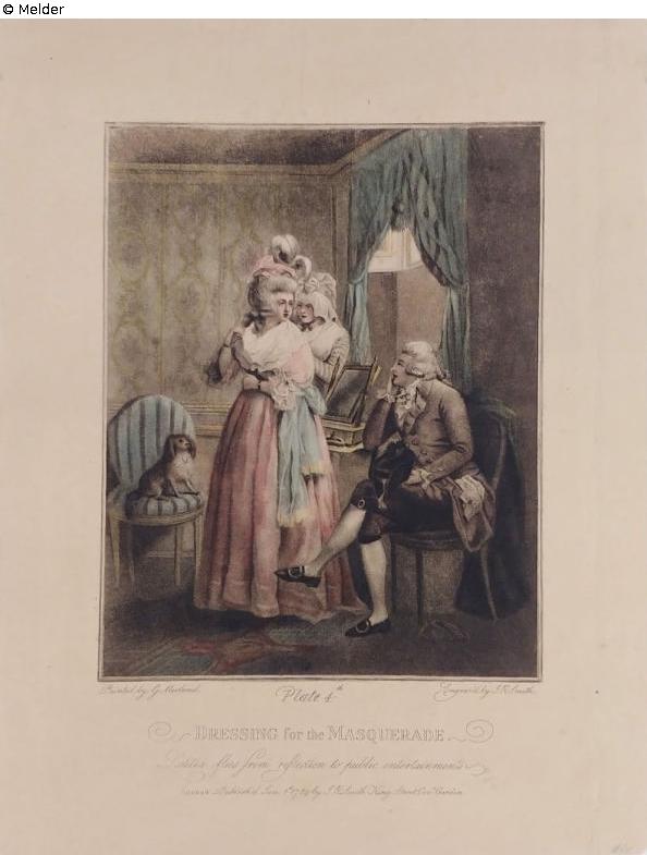 Impressum: "Plate 4th/DRESSING for the MASQUERADE./Letitia flies from reflection to public entertainments/LONDON Publish'd Jan. 1st 1789 by J. R. Smith King Stree Cov.t Garden/Painted by G. Morland/Engraved by J. R. Smith".