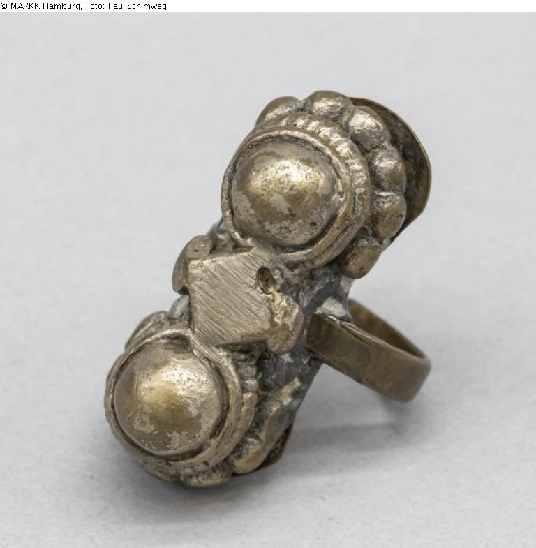 Fingerring mit länglicher Platte und Doppel-Kuppelverzierung, umfasst mit Granulierperlen. Fingerreif offen. Zwischen den Knöpfen eine kleine Zierplatte. Bodenplatte seitlich offen. Ring und Technik lässt auf Herkunft Rajasthan/Indien schließen.