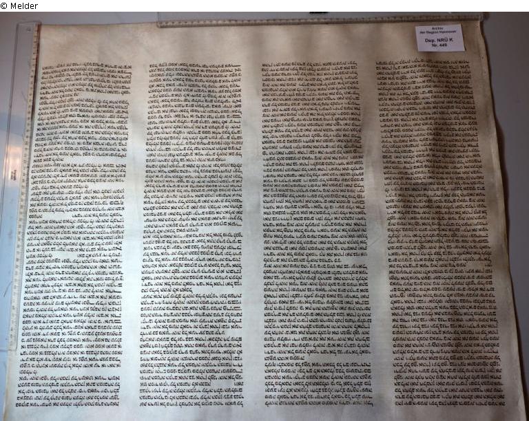 Fragment einer Thorarolle der Synagoge in Neustadt a. Rbge.; einzelnes Blatt, Pergament, 4-spaltig beschrieben in hebräischer Schrift; das Fragment enthält den Text 3. Buch Mose 4.336-10.1.