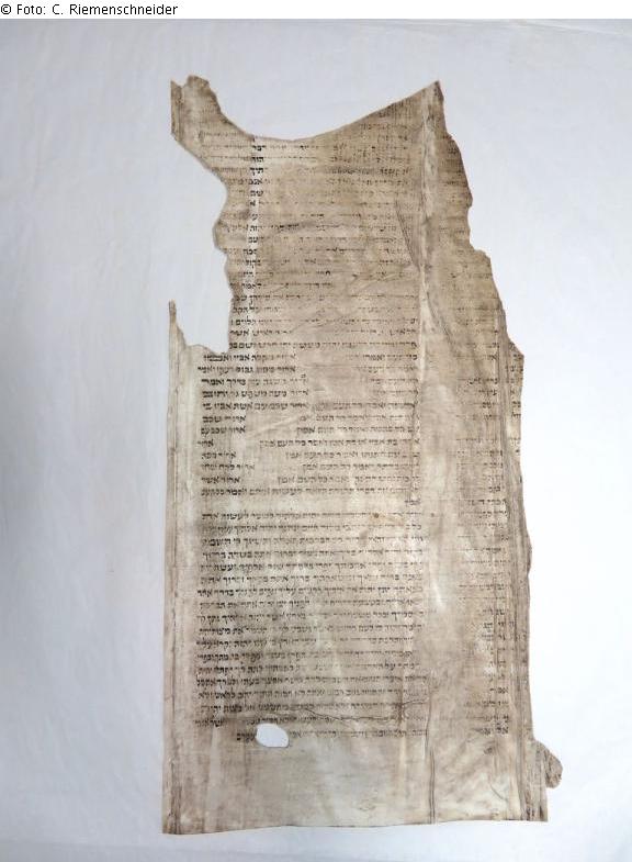 Fragment einer Torahrolle (hebr. sefer tora), hebräischer Text, Abschnitt Kap. 27 bis 28:14 (Deuteronomium), handgeschrieben in hebr. Quadratschrift. Das Fragment besteht aus einem spezifischen Typ von Pergament (hebr. klaf, gespaltene Haut) eines koscheren Tiers. Geschrieben mit einer schwarzen Tinte (hebr. dejo), wahrscheinlich Eisen-Gallus-Tinte mit Rußanteilen, in hebräischer Quadratschrift mit einer Feder (hebr. kulmus, urspr. ein Schilfrohr) mit der Hand. Das Pergament ist am oberen Ende und der echten Seite des Blattes zerrissen, im unteren Teil links ist ein Loch.