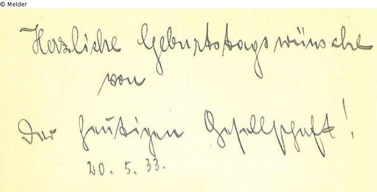 NS-Raubgut 1.) Geschenk der Stadt Speyer an die Saarpfälzische Landesbibliothek 1941 im Zuge der Deportation der saarpfälzischen Juden am 22.10.1940 nach Gurs (Frankreich) 2.) Widmung "Herzliche Geburtstagswünsche von der heutigen Gesellschaft! 20.5.33", vmtl. an: Herz, Reinhold, geb. am 20.5.1913 in Speyer; 1938 Emigration nach New York; gest. am 5.8.1980