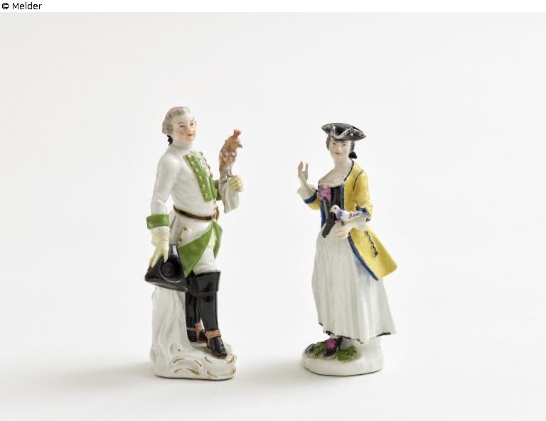 Die Frau ist in ein weißes Gewand mit schwarzem Miedereinsatz und gelber Jacke gekleidet. Auf dem Kopf trägt sie einen schwarzen Dreispitz. Die rechte Hand ist erhoben, auf der linken sitzt eine Taube. Ausformung des Modells “Jägerin mit Jagdbuchse” Alte Formnummer 505, ursprünglich mit Gewehr am Arm, zeitgenössische nicht modellgerechte Restaurierung mit Taube; Aufkleber mit Inventarnummern des Museums, unleserliche Handschrift auf Unterseite der Figur