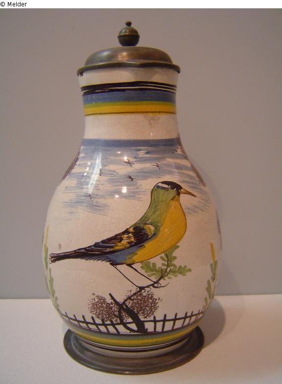 kugelig birnförmiger Krug mit Zinnmontierung: Deckel, Standring. Weiß glasierter, rötlicher Scherben mit feiner Scharffeuermalerei in Mangan (Umriss und Kontur), Grün, Gelb und Blau. Farben z.T. geschrumpft, Glasur leicht unrein mit Nadellöchern am Mündungsrand und feinem Krakelee.