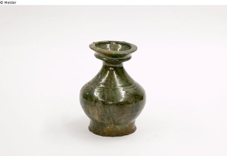 Bauchiger Gefäßkörper; Dunkelgrüne Glasur mit Tropfspuren auf rötlich braunem, dickwandigem Scherben, stellenweise irisierend