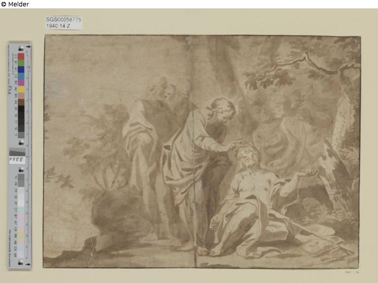 Verso in Blei: „Van Dyck Schule)“; darunter in Blei, wegradiert (?): „(W Cam… [unleserlich]“; Ecke unten rechts: Reste einer Beschriftung in Blei, unleserlich; unten links in Blei: „E [oder F] […]“, unterstrichen. Darüber in Blei geschrieben: „lbw.“, darüber 2 Striche mit Bleistift.