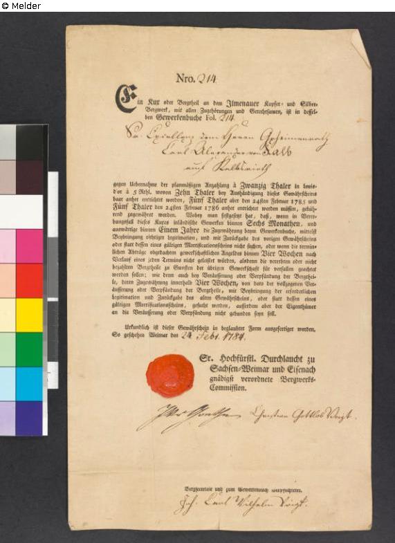 Ilmenauer Kux [Anteilsschein am Ilmenauer Kupfer- und Silber-Bergwerk] Nr. 214 für Karl Alexander von Kalb auf Kalbsrieth, 24. Febr. 1784.