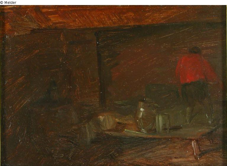 Motiv: Auf der rechten Seite verlässt ein Bauer in roter Jacke schwankenden Schrittes den Innenraum. Rechts im Vordergrund steht eine Bank mit Krug, Glas und Geräten, links ein großer Hackklotz. Werkvz.-Nr. Gm 405