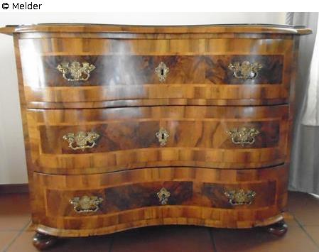 Kommode mit drei Schüben und geschwungener Front. Rechts und links an jedem Schub zwei nach unten geschwungene Griffe, mittig in jedem Schub ein Schloss. Geschwungene Deckplatte mit seitlich und vorn nach außen umlaufender Rundkehlung. Vier Füße als abgeflachte Kugeln.