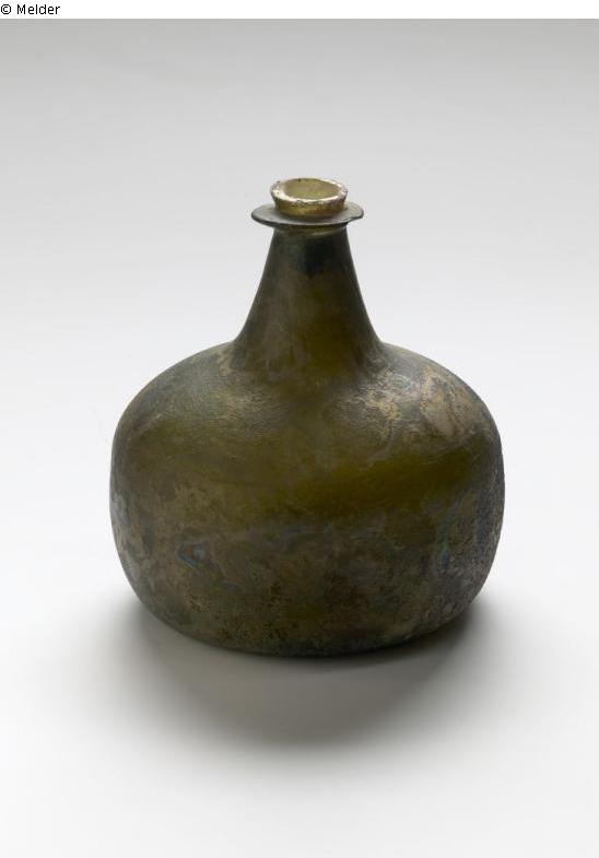 Gedrückt-kugeliger Flaschenkörper mit stark hochgestochenem Boden, kurzem, konischem Hals und einem scheibenförmigen Ring unterhalb des Randes, von dem ein Stück ausgebrochen ist.