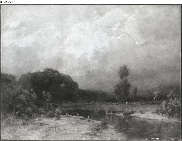 Landschaft mit Fluss und Viehherde