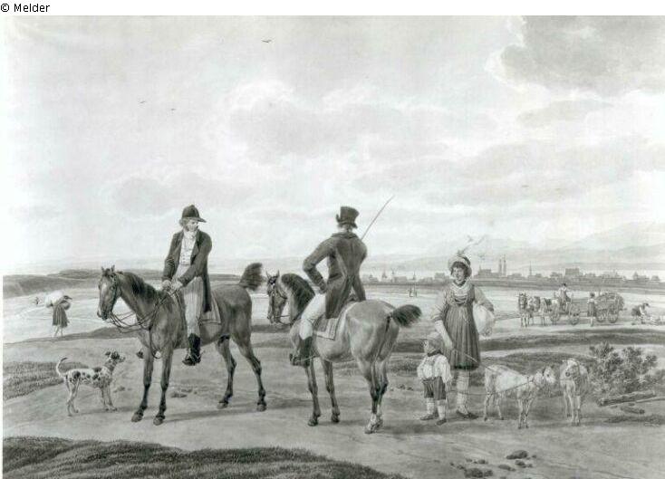 Fundmeldung | Einzelobjekt Landschaft mit zwei Reitern Lost Art-ID220950 Vorherige Weiter Hersteller/Künstler:in Kobell, Wilhelm Alexander Wolfgang von Geburt 1766.04.06, Mannheim Tod 1855.07.15, München WirkungsortMannheim; München; Paris TitelLandschaft mit zwei Reitern Datierung1802ObjektartAquarellObjektgruppeGrafikMaterial / TechnikWasserfarbe / aquarelliert Höhe 25,00 cm Breite 35,00 cm Inventarnummermü9534Beschreibung Signatur: Wilhelm Kobell 1802; Vorn die Reiter und eine Frau mit Kind, das 2 Schafe an der Leine hat. Rechts Mittelgrund Wagen. Hintergrund Stadtkulisse. Weiterlesen Weniger anzeigen Bestand Kulturgüter aus dem ehemaligen ReichsvermögenVeröffentlicht seit2001 Kontakt Kunstverwaltung des Bundes Herbert-Bayer-Straße 5 13086 Berlin Deutschland E-Mailprovenienzforschung@kvdb.bund.deHomepagehttp://www.kunstverwaltung.bund.de
