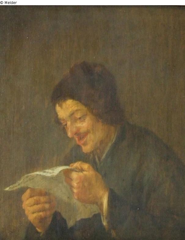 Genreszene – Brustbild im Dreiviertelprofil nach links; lachender Bauer mit brauner Kappe, der mit beiden Händen ein beschriebenes Blatt hochhält; brauner Hintergrund