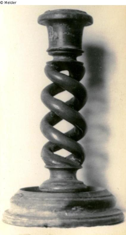 Kerzenhalter, "auf der Lichttülle mit hebräischen Schriftzeichen" [Karteikarte Beelitz, vor 1954] / "Leuchteroberteil mit gedrehtem Stiel und schwarzer Aufschrift in hebräisch und deutsch: Jerusalem, Leuchterunterteil fehlt" [Karteikarte Potsdam-Museum, 1981]