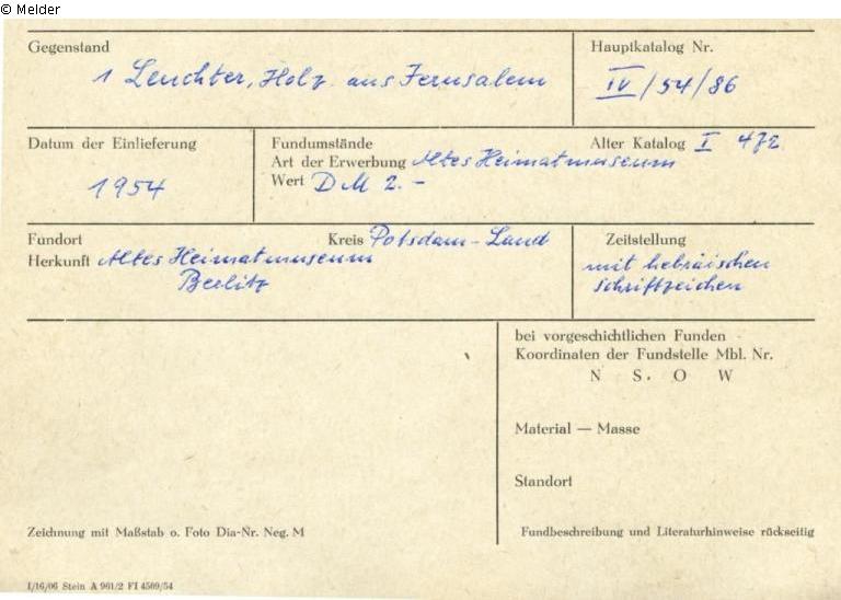 Objekt bisher nicht aufgefunden, Karteikarte vorhanden: Übernahme 1965 aus dem aufgelösten Heimatmuseum Beelitz, dort Altbestand gewesen