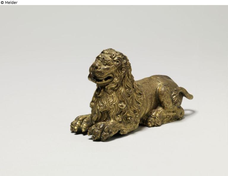 Der Löwe liegt mit kräftig gebildeten, vorgestreckten Vorderpranken auf allen Vieren und hat das Haupt mit bleckender Zunge erhoben; der besonders gegossene Schweif ist angelötet. Ein Loch am oberen Teil des Hinterhauptes und eine scharf ausgeprägte Druckstelle weisen auf eine Verwendung als Tragefigur.