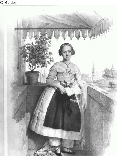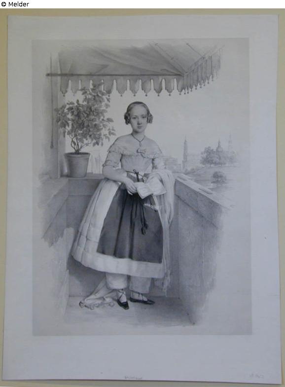 Das Mädchen hält ein Buch in der Hand. Darauf ist die Aufschrift lesbar: "Erinnerungen an Dresden 1844, gesammelt von Pauline Hanfstängl."