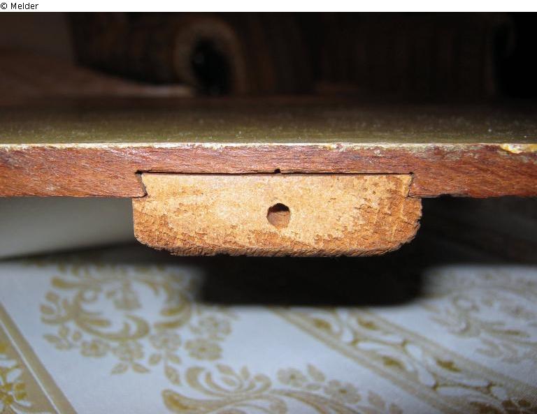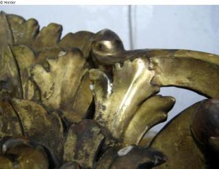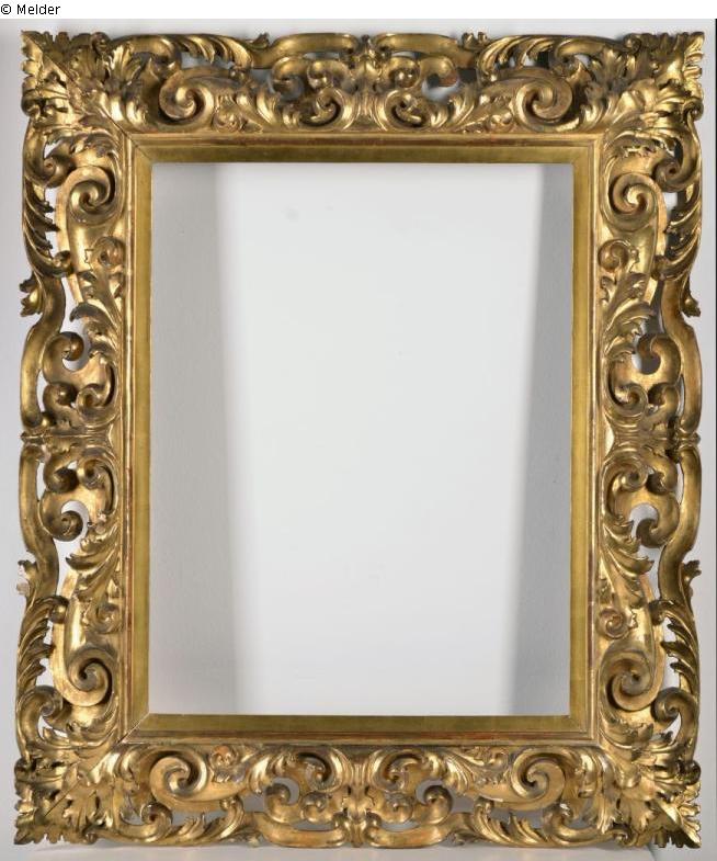 Rahmen: Linden- oder Nuβbaumholz, Auβenmaβ: 92 cm x 78,5 cm, im Barockstil, aus vier genau angepaβten Elementen bestehend. Der Rahmen ist reich mit Pflanzenmotiven geschnitzt, mit Dukatengold überzogen, an manchen Stellen abgetragen. Auf einem Teil gekratzter Buchstabe „G”. Das Innere des Rahmens ergänzt mit Holzausfüllung einer anderen Art. Auf der Rahmenrückseite oben massiver Haken, daneben ein beschädigtes, im Handel erhältliches Papieretikett, die Zugehörigkeit zu jemandes Kunstsammlug oder die Inventarisierungsnummer bezeugt. Der Barockrahmen kann Ersatz oder ein Teil der ursprünglichen Ausstattung der Supraporte in einem Palast oder Schloβ sein.