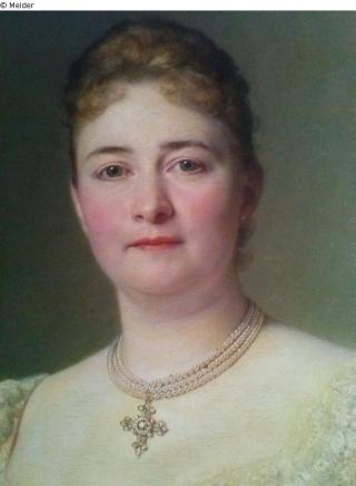 Das Gemälde: stellt eine deutsche Adelige im Seidenballkleid aus den Jahren 1892-1895, mit schöner Spitze, unsymetrischen Bäuschen, Kleidteilen und –Motiven dar, mit drei Perlenketten, dem aufgehängten Kreuz und anderen, symbolischen, diskreten Merkmalen der Gretchen-Symbolik. Bescheidenes Haar und Schmuck, lange Handschule über die Ellbogen, lachsfarbig.
