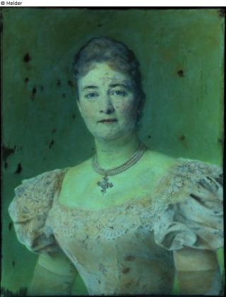 In den 20. Jahren des XX. Jhs hat Carl Moll unter unklaren Umständen die Supraporte mit dem schönen Bildnis der geliebten Frau übernommen und überarbeitet. Der untere Holzteil wurde asymmetrisch zugeschnitten, infolge dessen das Gemälde wahrscheinlich der Signatur oder einer anderen Aufschrift entzogen wurde. Die Gestalt der Ehefrau hat Carl Moll in fast unveränderten Form belassen. Dagegen hat es einen Eingriff in den Hintergrund gegeben, wovon zahlreiche tiefe Retuschen (Expertise von LANBOZ-Ultraviolett) und der im Stil der 20. Jahren des XX. Jhs übermalte Hintergrund zeugen. Das alles hat allgemeines Erscheinungsbild des Porträts geändert. Solche modifizierte Supraporte wurde durch den Zuschnitt völlig anonym, auf der Rahmenrückseite lediglich mit einem alten, beschäigten Papieretikett mit der Nummer „35” versehen. Sie wurde dann in den goldenen Rahmen gesteckt. In solcher veränderten Form, als Familienandenken von Carl Moll, wurde sie zum Wandgemälde, welches als im zweiten Weltkrieg „vernichtetes” Kunstobjekt galt.