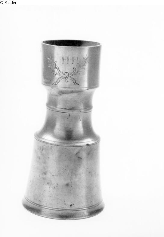 Über einem durch gravierte Linien abgesetzten Fuß steigt die Wandung konisch an. Mittig wird der Korpus zum langen, schlanken Hals hin eingezogen, wobei der Hals durch einen Wulstring betont ist. Der hohe zylindrische Rand weist über zwei gravierten Palmenzweigen die Initialen "HH" auf. Am Rand befindet sich der Meisterstempel sowie "18" und "02". Markierung in schwarzer Schrift auf der Objektunterseite: "R./D."
