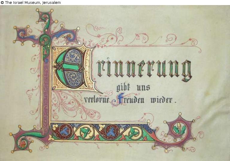 Fundmeldung | Einzelobjekt A memory album with illustrations (Erinnerung gibt uns verlorne Freuden wieder) Lost Art-ID572691 Vorherige Weiter Link to item in IMJ siteLink to the main site Autor:in Anonymous TitelA memory album with illustrations (Erinnerung gibt uns verlorne Freuden wieder)ErscheinungsortGermany Erscheinungsdatum19th century (?)ObjektartBuchObjektgruppeBibliotheksgutMaterial / TechnikWatercolor on paper Höhe 19,00 cm Breite 30,60 cm InventarnummerB51.12.3029Beschreibung Object Name: Book Weiterlesen Weniger anzeigen Provenienz Received through JCR (Jewish Cultural Reconstruction), via the National Library of Israel, Jerusalem Weiterlesen Weniger anzeigen Veröffentlicht seit10.01.2018 Kontakt Israel Museum POB 71117 9171002 Jerusalem Israel Tel972-2-6708811Fax972-2-5631833E-Mailinfo@imj.org.il Ansprechpartner:in Bareket MannPositionRegistrarE-Mailbareket@imj.org.il