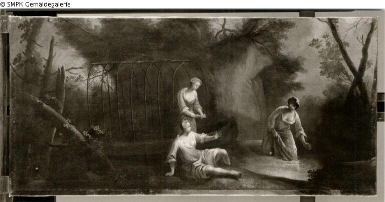 Parklandschaft mit Barke und drei badenden Frauen