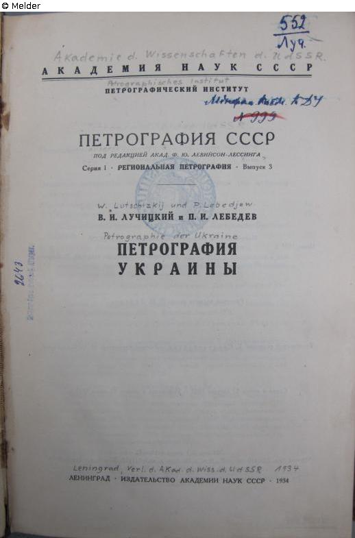 8°, auf Titelblatt unkenntlich gemachter Vermerk Mineralogisches Kabinett der KDU [Kiever Staatliche Universität] Nr. 999 und unkenntlich gemachter Stempel Kabinett der geologischen und geografischen Literatur [der KDU]