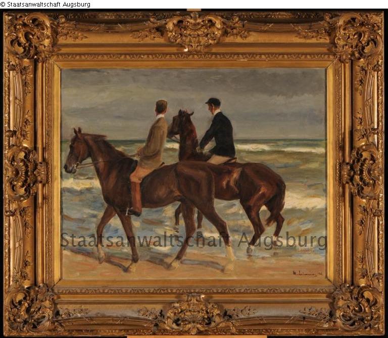 verso, auf Rahmen, oben links in rotem Wachsstift: “225” [im Kreis]; in blau: “No. 19”, “L. 22”; oben links, kleines, weißes Etikett, handschriftlich: “1930”; oben Mitte bedrucktes braunes Etikett: “Secession Berlin Schwarz-Weiss-Ausstellung 1906 / 1872”; in blau: “8.”, “23” [im Kreis]; oben rechte Ecke, maschinegeschriebenes Etikett: “Regal [...]”; Etikett des Rahmenherstellers: “Albert Sue[...] Gemälde-Rahmen-Fabrik [...] Moderne Einrahmungen [...] Berlin [...] 82. Gegründet 1873”; braunes Etikett: “Deutsch-nationale Kunstausstellung Düsseldorf 1902 Versand / Gruppe Berliner Secession / Lagernummer / Künstler M. Liebermann / Gegenstand Reiter am Strande / Empfänger Gemäldeausstellung Lichtenberg / Stadt Breslau / Zeichen und Nummer B [?] AL 544 / Versand als G[...]”; weißes Etikett, handschriftlich: “Frau Helene Gurlitt Düsseldorf Rotterdammer Str. 35”; unten links, in blauem Wachsstift: “7.”; beiges Etikett: “Deutsch-nationale Kunst-Ausstellung Düsseldorf 1902 / 1863”; unten rechts, in blauem Wachsstift: “Wie 1930“; weitere unleserliche, blaue Beschriftungen