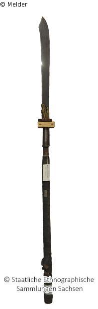 Chinesische Säbellanze Typ Chai Dao, Klinge durch Tigerkopf eingefassst, am Stiel Metallschild mit gestanzter Nummer 37.286