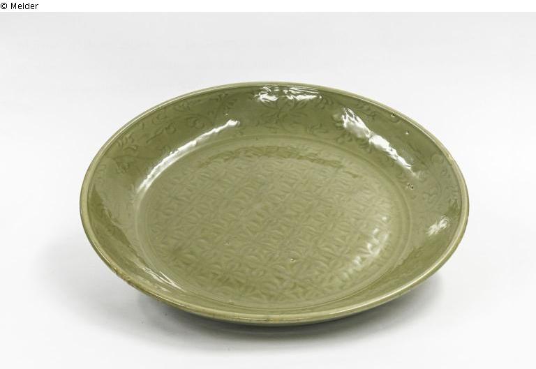 Zhejiang-Seladon, grauer, schwerer Steinzeugscherben; In den Boden ist eine arabische Inschrift, in der Transkription als 'S 19' zu lesen, eingeritzt