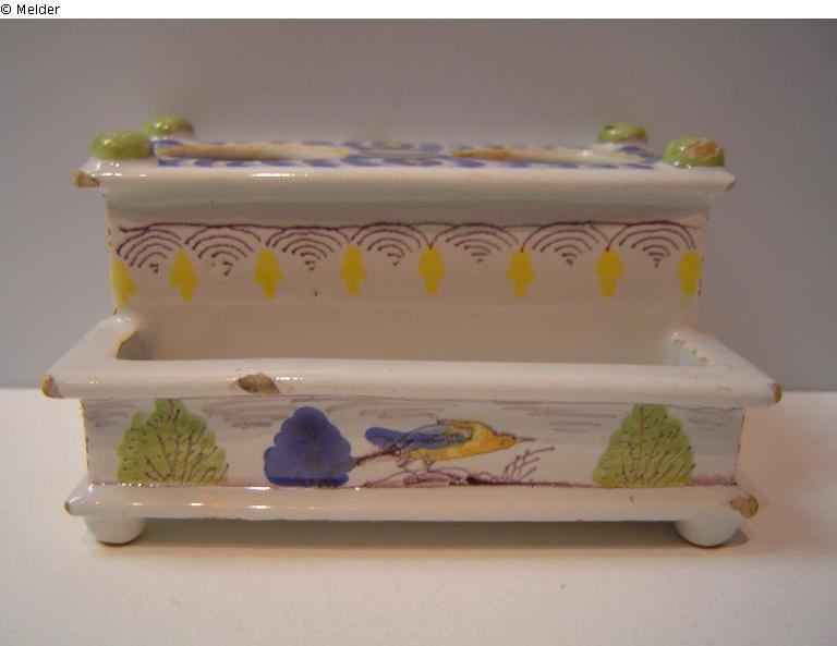 rechteckiger kastenförmiger Körper auf breiterer, rechteckiger Bodenplatte (Federablage) und gedrückten Kugelfüßen. Erhöhtes vorkragendes Gesims sowie vorkragende Deckplatte mit runden Aussparungen für Streusand- bzw. Tintengefäß, auf den Ecken halbrunde Knäufe. Bläulich-weiß glasierter, heller Scherben mit feiner Scharffeuerbemalung in Mangan, Gelb, Ocker, Blau und Grün.