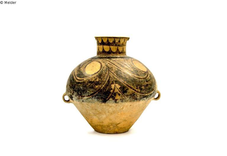 Strohfarbene Irdenware, Banshan-Typ [Gansu] der neolithischen Yangshao-Kultur, Aufbaukeramik; Zwei Ösenhenkel an der Bauchung