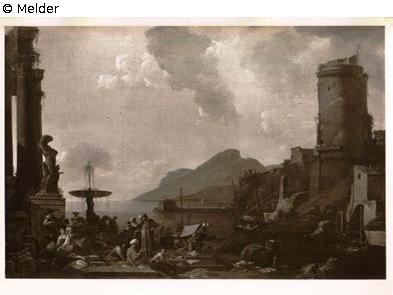 Links ein Brunnen, eine Plastik auf hohem Sockel und Säulen mit Gebälk. Um den Brunnen lagernde und stehende Personen. Rechts der Befestigungsturm. Im Mittelgrund das Meer, rechts von Bergen begrenzt.