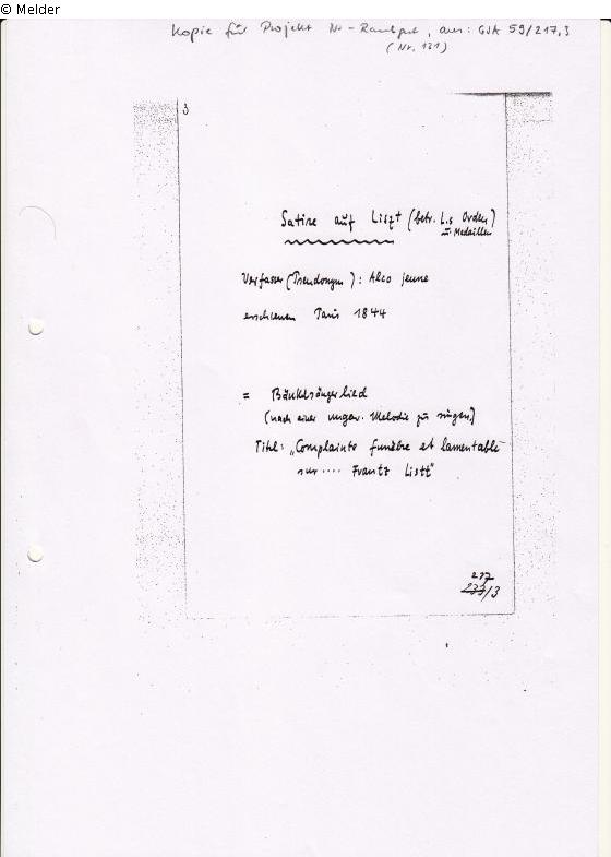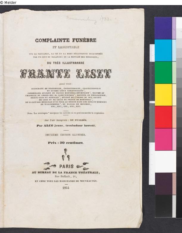 Spottschrift über Liszt mit Holzschnitten von Daumier u. a [Complainte funebre et lamentable sur la naissance, la vie ... du tres illustre Fr. Liszt. Par alco jeunne, troubadour brevete. Paris, au bureau de la France theatrale 1844. (handschr. Anmerkung