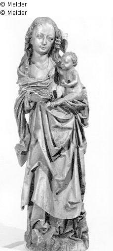 Holz ungefaßt; Wahrscheinlich fränkische Arbeit um 1500 aus der Schule des T. Riemenschneider. Ungefaßt. Mutter Gottes stehend im reichen Faltengewand mit Kopftuch und am Hals sichtbarer Unterkleidung. In der Rechten Weintrauben haltend ,auf dem linken Arm das Jesuskind. Das Jesuskind nackt mit einem Apfel in der Linken.
