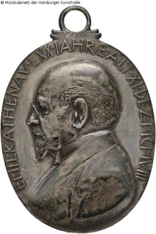 Vorderseite: Brustbild des Emil Rathenau nach links. Unten die Signatur H. HAHN, Legende: EMIL RATHENAV LXX IAHRE ALT XI DEZ MCMVIII; Rückseite: Ein Adler steht mit angelegten Schwingen auf einer Freiheitskappe (pilus) nach links. Über ihm ein Blitzbündel. Im linken Feld eine Grille/Heuschrecke, Legende: A E G B E W FVER VERDIENST VND - TREVE; guter Zustand.