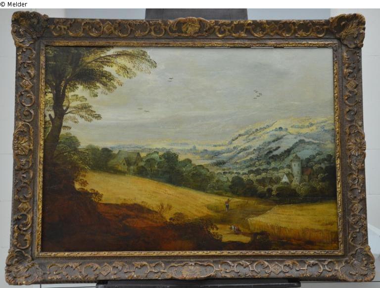 Landschaftsgemälde, Allegorie des Sommers, vergleichbar der Gruppe der Heubilder (heykens); der Rahmen trägt rückseitig einige verwaschene rote Stempel