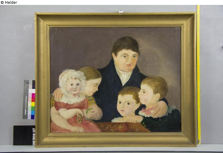 Das Gemälde zeigt einen Vater mit seinen Kindern an einem Tisch. Der Tisch bildet den unteren Rand des Gemäldes. Während der Vater zu sitzen scheint, haben seine drei größeren Kinder eng neben ihm stehend oder direkt vor ihm Platz gefunden. Das kleinste Kind sitzt vorn links im Bild auf der Tischplatte und wird von der dahinter stehenden, ältesten Tochter locker umfangen. Der älteste Sohn steht rechts im Bild. Er hat seinen Arm auf die Tischplatte gelegt und zeigt auf einen, auf dem Tisch liegenden Apfel. Die Dargestellten tragen bürgerliche Kleidung.