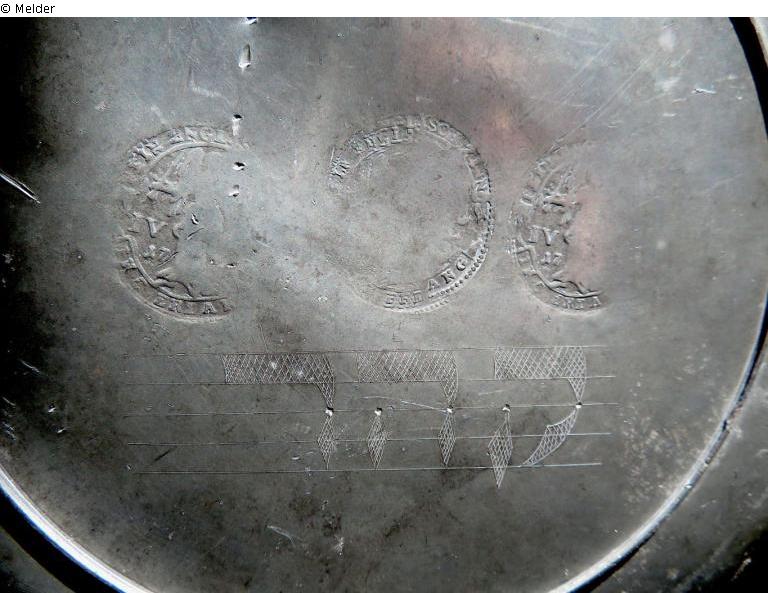 Zinnteller in Napfform, ohne Fahne. Auf der Unterseite gestempelt: 3 Engelmarken, "FEIN ENGLISCH ZINN", "I V C ERLANG", darunter die drei hebräischen Buchstaben graviert "k h r" (ergeben keine lesbare Wurzel, auch keine sinnvolle (Jahres)Zahl; evtl. Besitzerinitialen oder Verweis auf eine Gemeinde?)