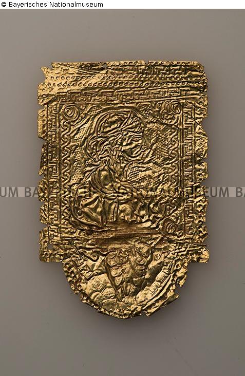 Provenienzforschung: Die Angaben des Central Collecting Point und der Treuhandverwaltung für Kulturgut beziehen sich allein auf den Kasten, in dem die Goldapplike zusammen mit insgesamt 21 Goldappliken (BNM 76/7.2-22) aufbewahrt wurde. Laut Restitutionskartei: "In Berlin bei Zeitner gemacht/Hofer?"; laut Datenbank zur 'Sammlung Göring': "Slg. Göring/Berchtesgaden (Altbesitz)?". Die Angaben des Central Collecting Point und der nachfolgenden Organisationen bzw. ihres Informanten Walter Andreas Hofer beziehen sich auf den Schaukasten von der Hand Herbert Zeitners (BNM Inv.-Nr. 76/7.1). Für die dort integrierten dünnen Goldappliken BNM Inv.-Nr. 76/7.2-22 (9 runde und 12 zungenförmige) fehlt bislang jede Angabe zur Provenienz. Bei den Goldappliken BNM Inv.-Nr. 76/7.11-22 handelt es sich sehr wahrscheinlich um Erdfunde; eine vor Juni 1941 durchgeführte Grabung mit entsprechenden Funden ist bislang nicht bekannt. Zungenförmige Goldappliken mit Münzbildimitationen, die formal jedoch kaum vergleichbar sind, sind in einem Tumulus in Sarkamen belegt, welcher der Mutter des Tetrarchenkaisers Maximinus Daia zugeschrieben wird (Auskunft von Dr. Yvonne Petrina, München). Möglicherweise zusammengehörig mit BNM Inv.-Nr. 76/7.2-10. Es kann sich nicht um "Altbesitz" handeln, wie in der Datenbank zur 'Sammlung Göring' angegeben. Durch die Datierung des Kastens lässt sich für die Goldappliken feststellen: Vor dem 27.06.1941 durch Göring auf bislang unbekanntem Weg und aus bislang unbekanntem Vorbesitz erworben. Im Auftrag von Göring vom 25.08.1941 durch Görings Bibliothekarin von Herbert Zeitner in den eigens dafür angefertigten Kasten (BNM Inv.-Nr. 76/7.1 integriert. Für den Erwerb der Goldplättchen konnte bislang kein Nachweis gefunden werden. Es bestehen folgende Möglichkeiten: 1.) Gastgeschenk des jugoslawischen Ministerpräsidenten Milan Stojadinovic 1938. -2.) Gastgeschenk des Prinzregenten Paul von Jugoslawien im Juni 1939. -3.) Raub durch die Deutsche Wehrmacht in Jugoslawien nach April 1941. - 4.) Raub durch die Deutsche Wehrmacht in Griechenland nach April 1941. - 5.) Beschlagnahme in den Niederlanden. -6.) Anfang des Jahres 1941 durch Josef Angerer und Karl-Heinrich Bodenschatz an Göring (unspezifizierter Griechenlandtermin am 12.01.1941 in Görings Tagebuch). Aufgrund der Provenienzlücke(n) kann ein NS-verfolgungsbedingter Entzug nicht ausgeschlossen werden./I.v.z.M., 2017