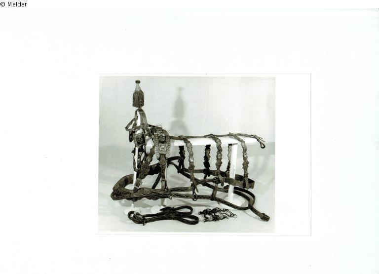2 identische Kutschgeschirre aus dunkelrotem Leder mit Ziersteppung und Bronzebeschlägen. Auktionskatalog: Kunstversteigerungshaus Helbing: Sammlung eines Rheinischen Großindustriellen. Frankfurter und Berliner Kunstbesitz (Katalog Nr. 48) Versteigerung Frankfurt am Main 11. - 13. Mai 1936, S. 50.