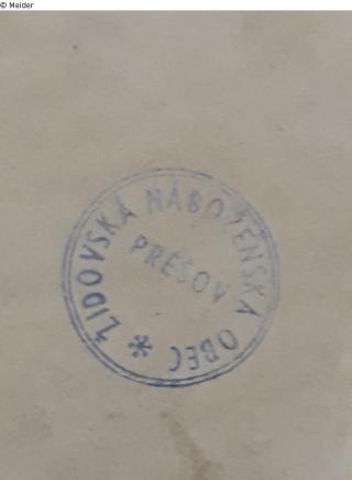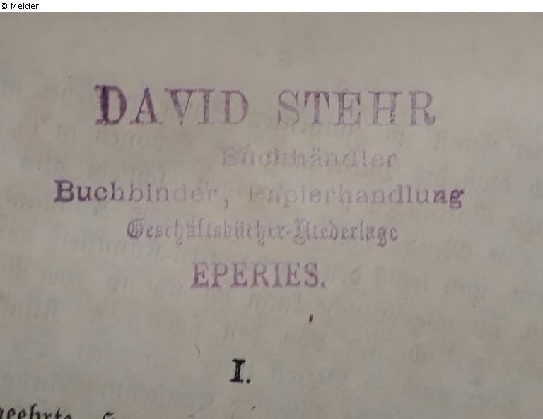 2 Vorbesitzer-Stempel auf der Titelseite innen, rechts: 1. DAVID STEHR | Buchhändler | Buchbinder, Papierhandlung |Geschäftsbücher-Niederlage | EPERIES. - 2. [im Kreis] ŽIDOVSKÁ NÁBOŽENSKÁ OBEC * PREŠOV