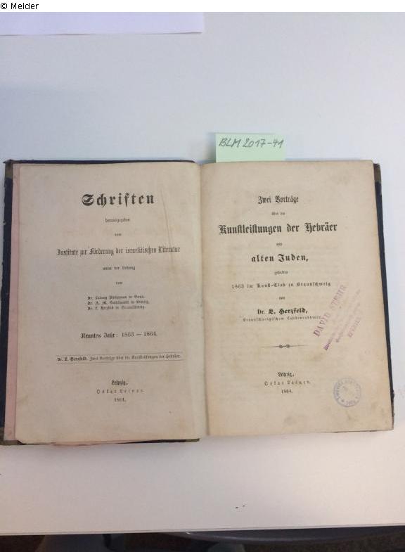 Zwei Vorträge über die Kunstleistungen der Hebräer und alten Juden, gehalten 1863 im Kunst-Club zu Braunschweig, Leipzig (Oscar Leiner) 1864