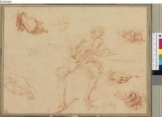 Fundmeldung In der Mitte sitzender Jäger, rechts drei Händestudien mit Schokoladentässchen, links zwei verschiedene Handstudien Hersteller/Künstler:in Lancret, Nicolas Objektart Zeichnung Material / TechnikRötel ; Papier hellbeige, hellgrau / gezeichnet ; montiertLost Art-ID584939
