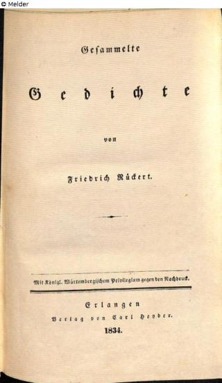 Fundmeldung Friedrich Rückert's gesammelte poetische Werke in zwölf Bänden ; Bd. 1 Autor:in Rückert, Friedrich Verlag Sauerländer Objektart Buch Lost Art-ID465808