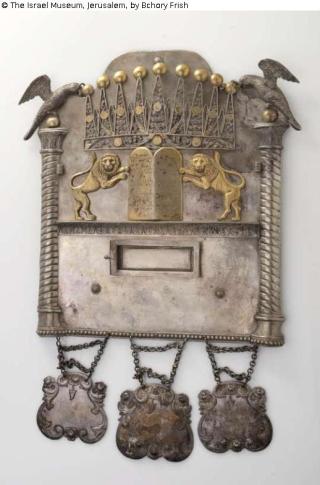Fundmeldung Torah shield decorated with parrots, lions, and crown Hersteller/Künstler:in Zimmermann Objektart Kunsthandwerk / -gewerbe Material / TechnikSilver / repoussé, stamped, cast, engraved, filigree, and...Lost Art-ID572977