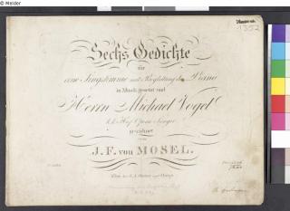 Fundmeldung Sechs Gedichte (3 Goethe, 1 Schiller, 1 Grillparzer) für eine Singstimme m. Begleitung des Pianos. In Musik gesetzt u. Herrn Michael Vogel gewidmet. Wien S. A. Steiner (3014). Verfasser:in Mosel, Ignaz Franz v. [Komponist] Objektart Archivgut Lost Art-ID526581