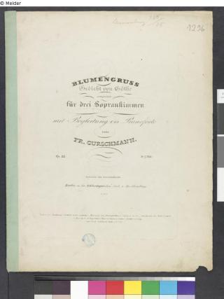 Fundmeldung Blumengruß, Gedicht von Goethe, componirt für drei Sopranstimmen mit Begleitung des Pianoforte von Fr. Curschmann, op. 22. Verfasser:in Curschmann, Karl Friedrich [Komponist]; Goethe, Johann Wolfgang von (1749-1832) [Autor] Objektart Archivgut Lost Art-ID526595