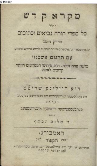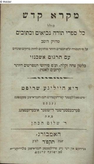 Fundmeldung Mikra kodesh kolal kol sifrei torah, nevi'im u-ketuvim im targum ashkenaz (Die Heilige Schrift einschließlich aller Bücher der Torah, der Propheten und Schriften mit deutscher Übersetzung) Drucker:in Josef Ernst Objektart Buch Lost Art-ID304022